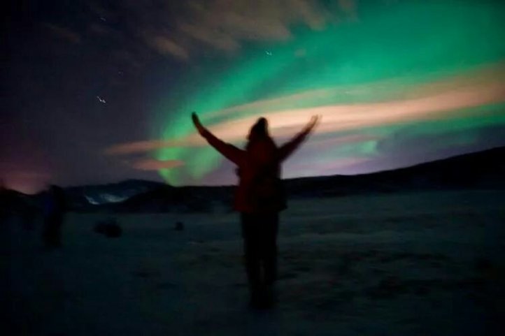 夜幕星空下,極光可見,我能找到的與極光合影的最佳姿勢就是傻傻的張開雙臂! 完全臣服於美景!