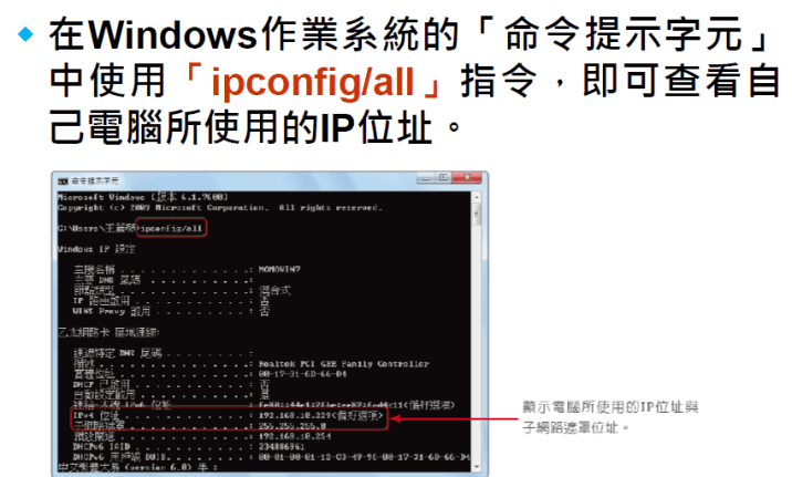 查詢本機虛擬IP:命令提示字元 執行 Ipconfig/all 或