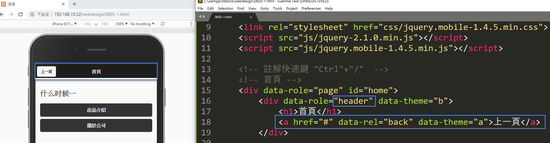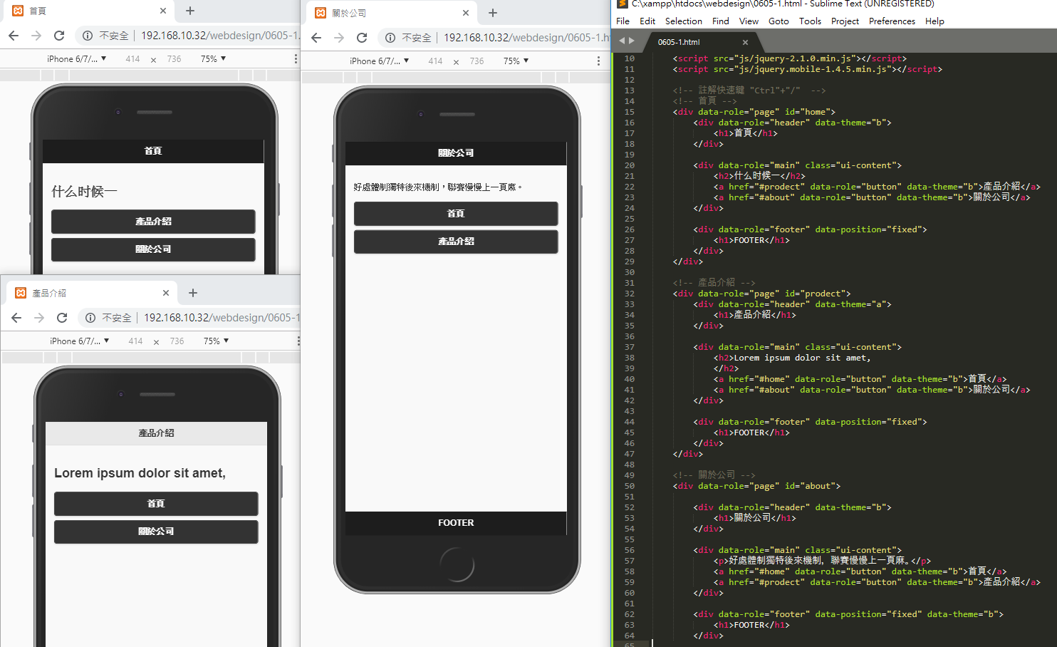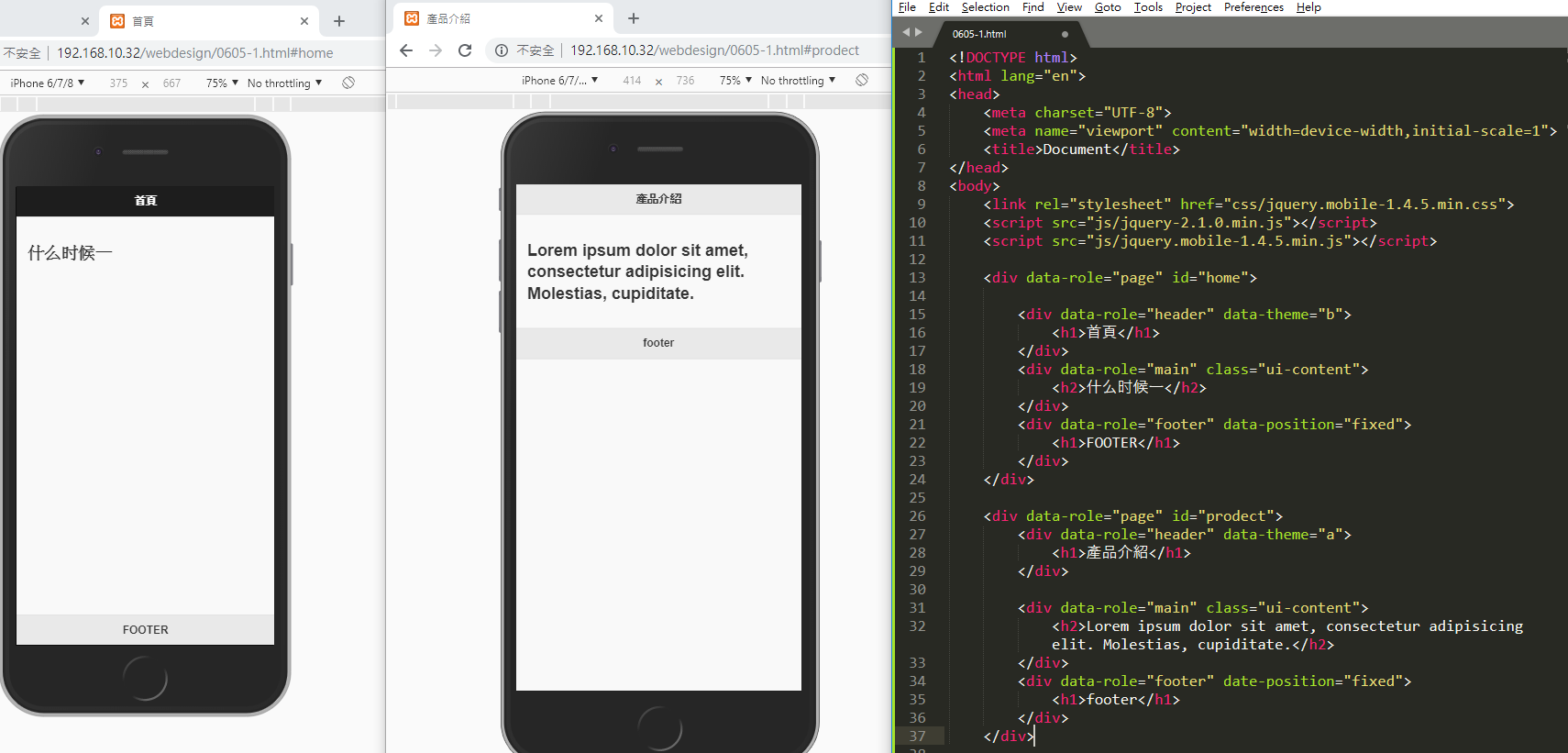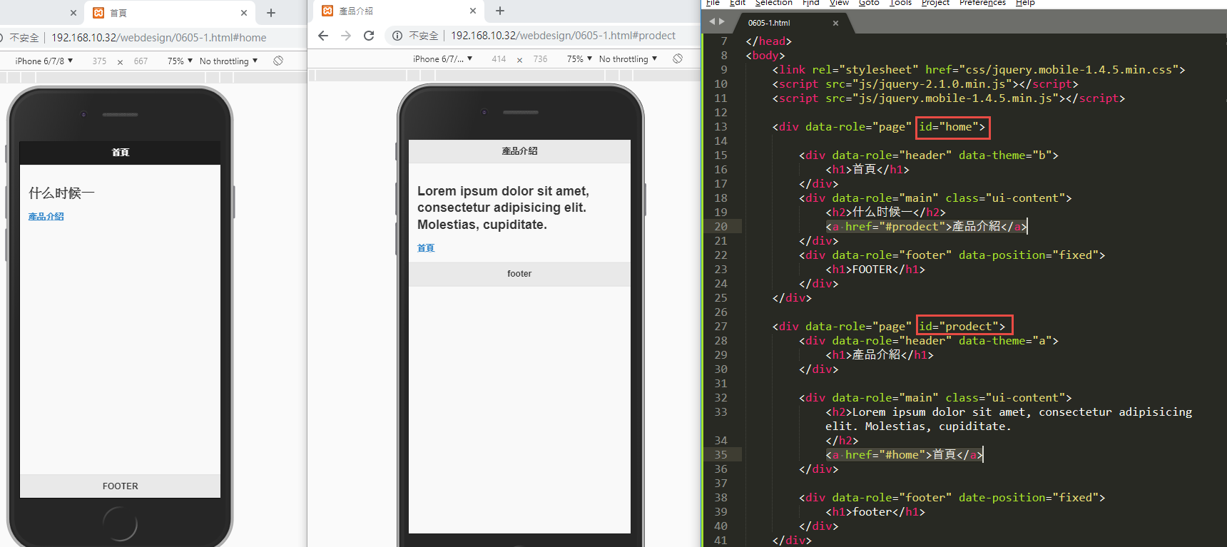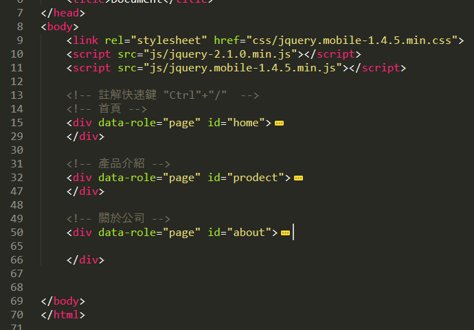 jQuery Mobile 網頁是使用 HTML5 格式設計,必須在網頁第一行加上宣告。