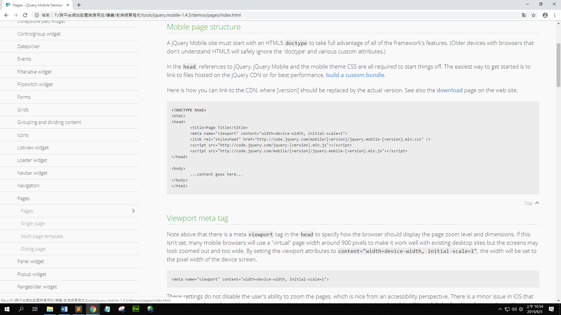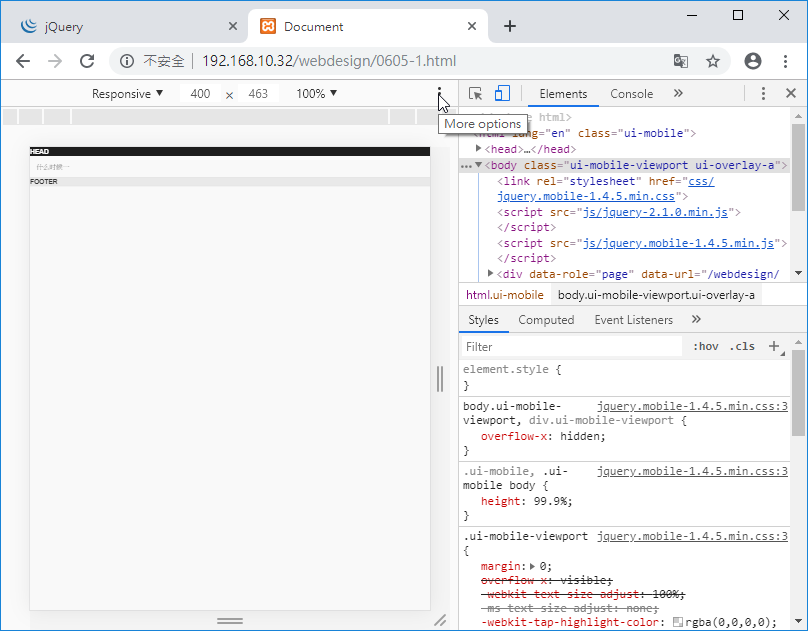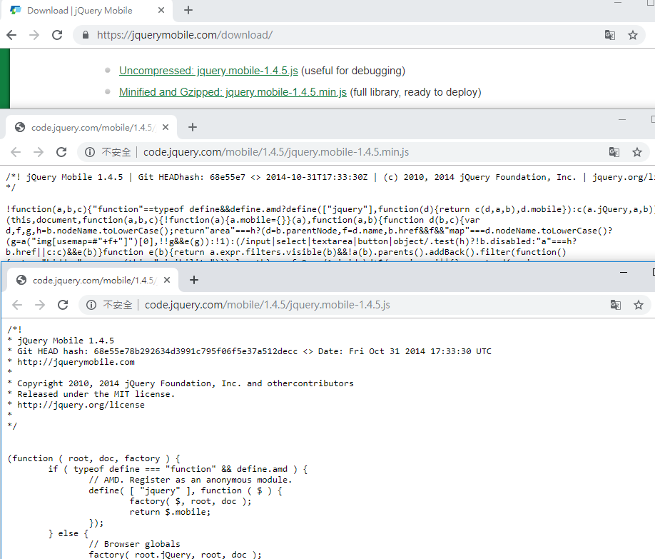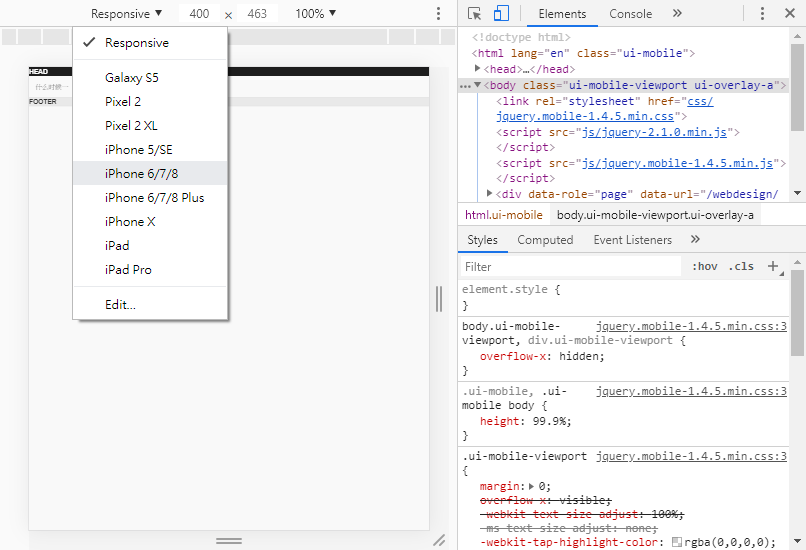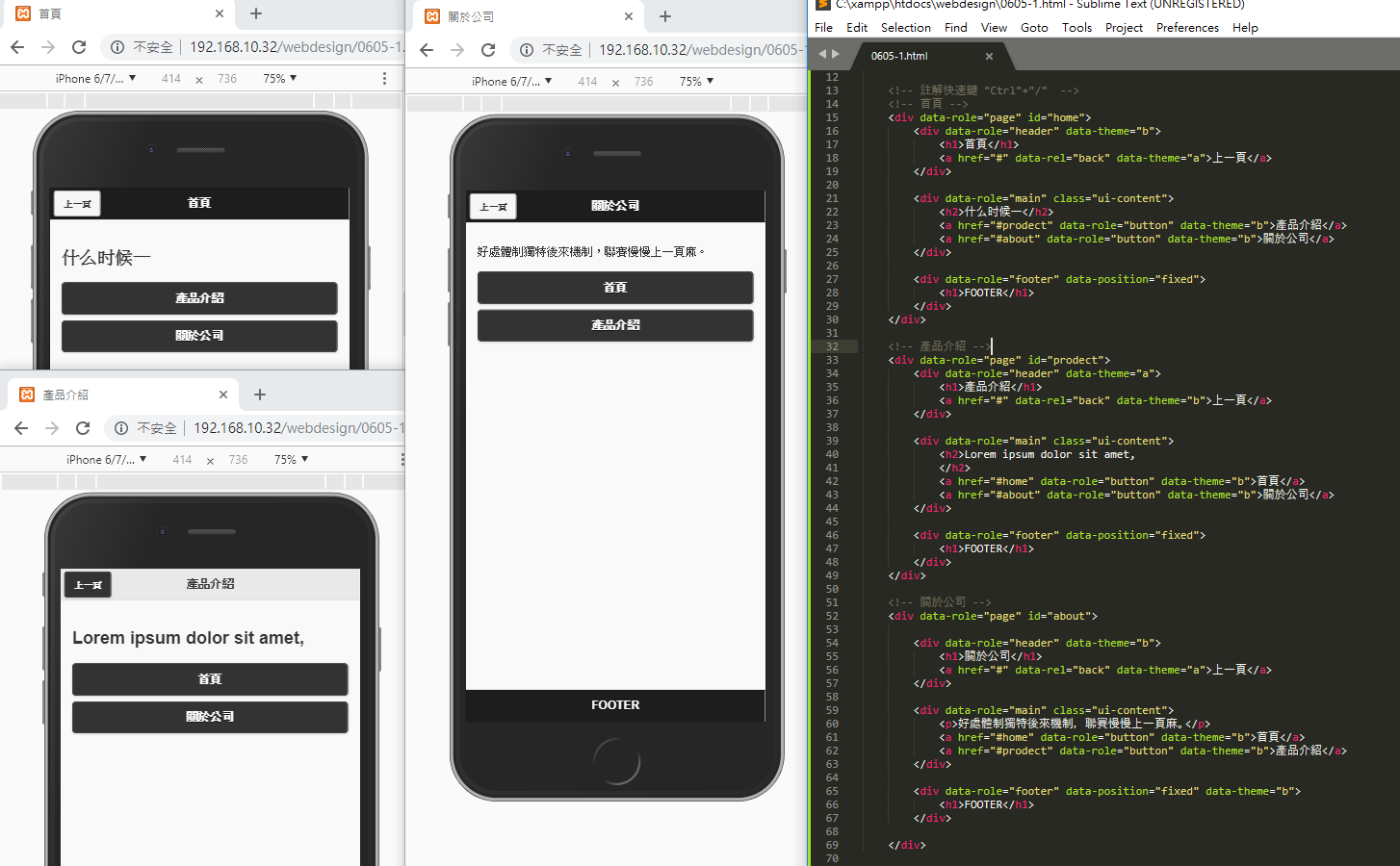 jQuery Mobile 網頁是使用 HTML5 格式設計,必須在網頁第一行加上宣告。