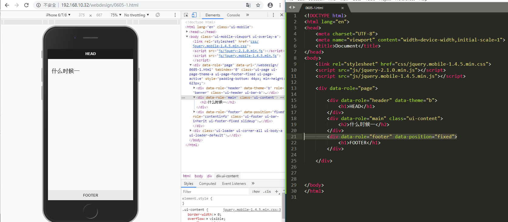 在header或footer加上data-position="fixed"可將頁首與頁尾固定在最上方與最下方