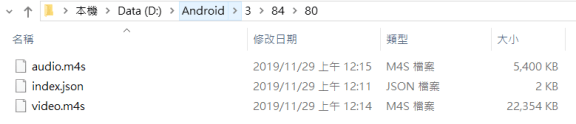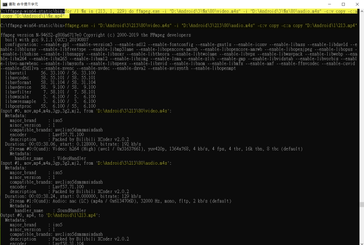 ffmpeg.exe -i “D:\Android\3\84\80\video.m4s" -i “D:\Android\3\84\80\audio.m4s" -c:v copy -c:a copy “D:\Android\1\80.mp4″